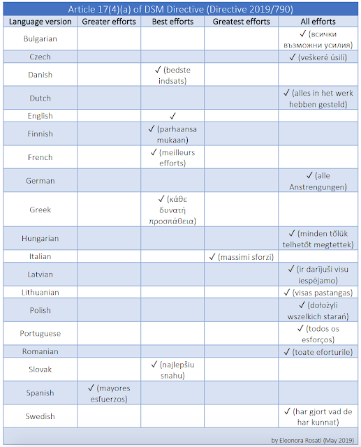 Oltre a questo errore macroscopico, l’esperta di copyright Eleonora Rosati, dopo aver analizzato il testo della Direttiva con l’aiuto di numerosi esperti di vari Paesi UE, ha scritto su IPKat che, un altro paragrafo dell’art. 17 sarebbe stato tradotto in maniera diversa nelle varie lingue UE.